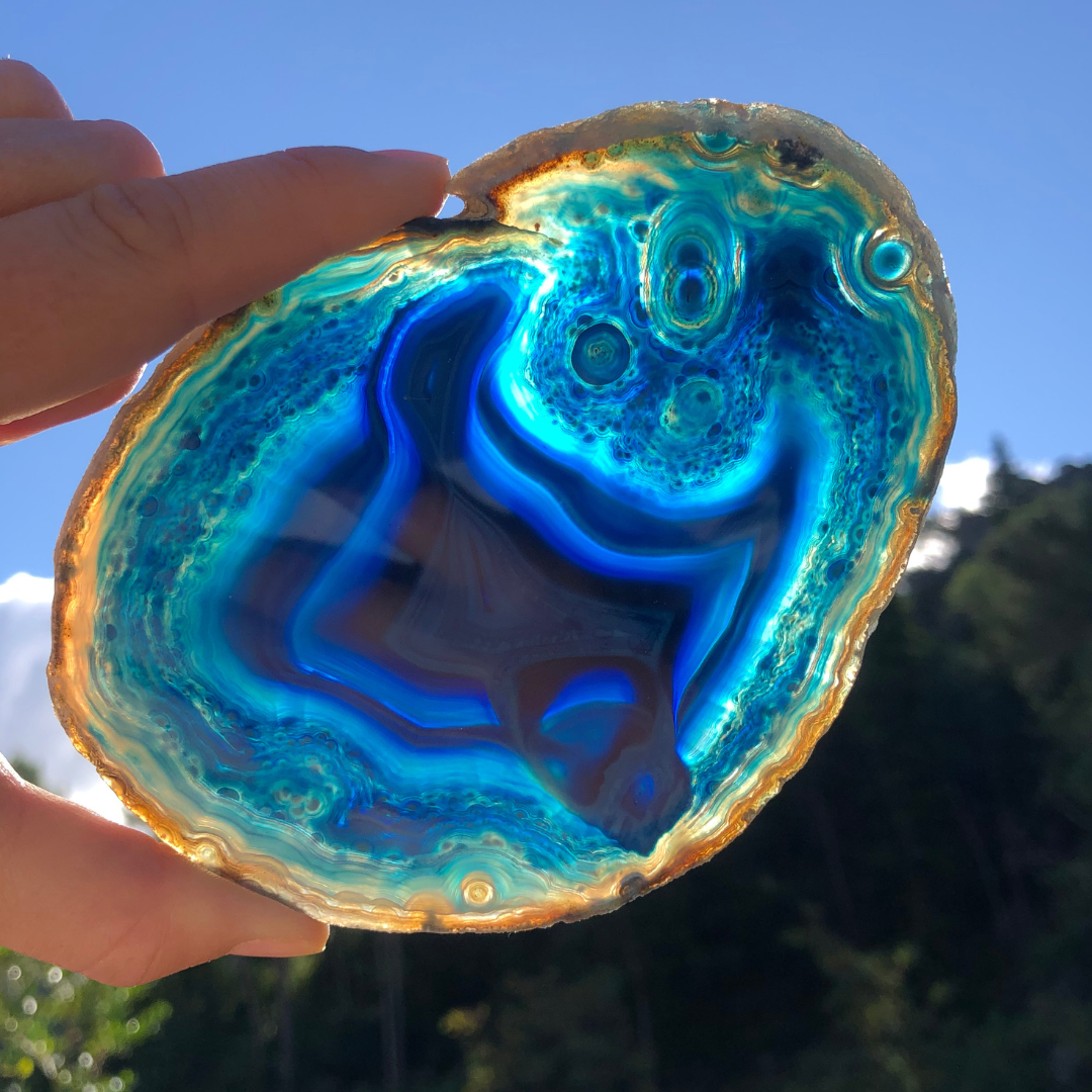 Nous avons sélectionné de très belles tranches d'agate. Thierry et Elisabeth les ont rapportés du Brésil. Chaque tranche est différente et unique , nous les emballons avec le plus grand soin afin qu'elle vous parvienne en parfait état. Vous pouvez les exposer à la lumière, sur une étagère... Chaque Agate que vous recevez est une merveille et un plaisir pour les yeux,